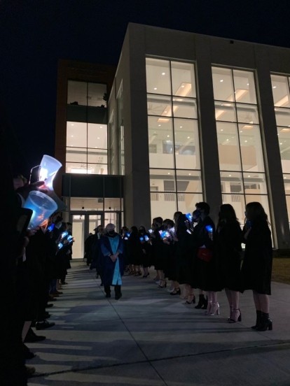Senior student Amy Graham closed the evening ceremony, leading her classmates in lighting individual candles. Students formed a candlelight procession exiting each venue, illuminating a path for faculty and staff as a symbol of the path faculty and staff have illuminated for them. These paths, Ms. Graham said, also serve as reminder for the future, “which we know will be bright…and a reminder to keep the StFX flame burning bright.”