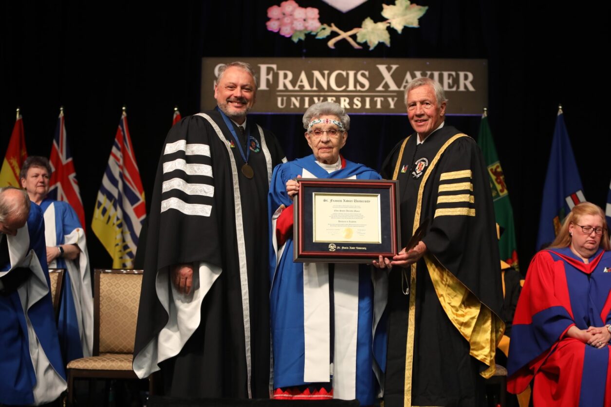 Elder Sister Dr. Dorothy Moore (centre) with StFX President Dr. Andy Hakin (left) and Chancellor John Peacock