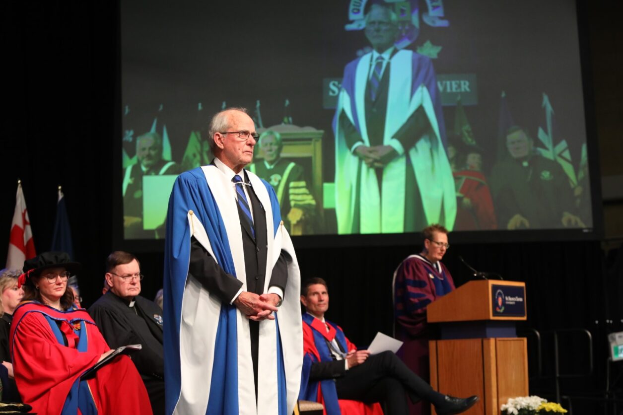 StFX paid tribute to Mr. Peacock who is coming to the end of his term as chancellor. Senior class co-presidents Abbey Mombourquette and Taylor Gorman thanked Mr. Peacock for his many contributions to StFX.