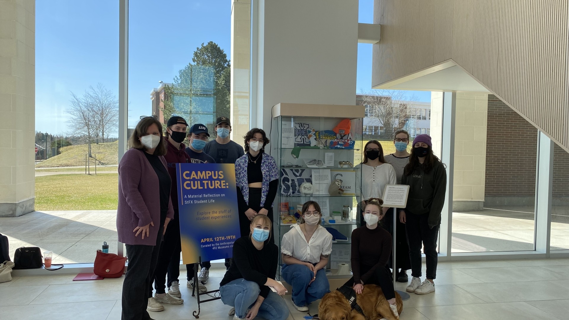 Students in ANTH 492: Museums, a senior seminar course offered by the Department of Anthropology, recently curated a public exhibit on StFX student experiences. Campus Culture: A Material Reflection on StFX Student Life was installed in a glass vitrine in Mulroney Hall. Working in partnership with the StFX Art Gallery, students planned, researched, designed, and installed the exhibit, which ran from April 12th to 19th.