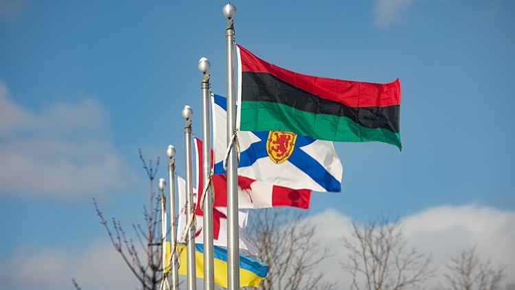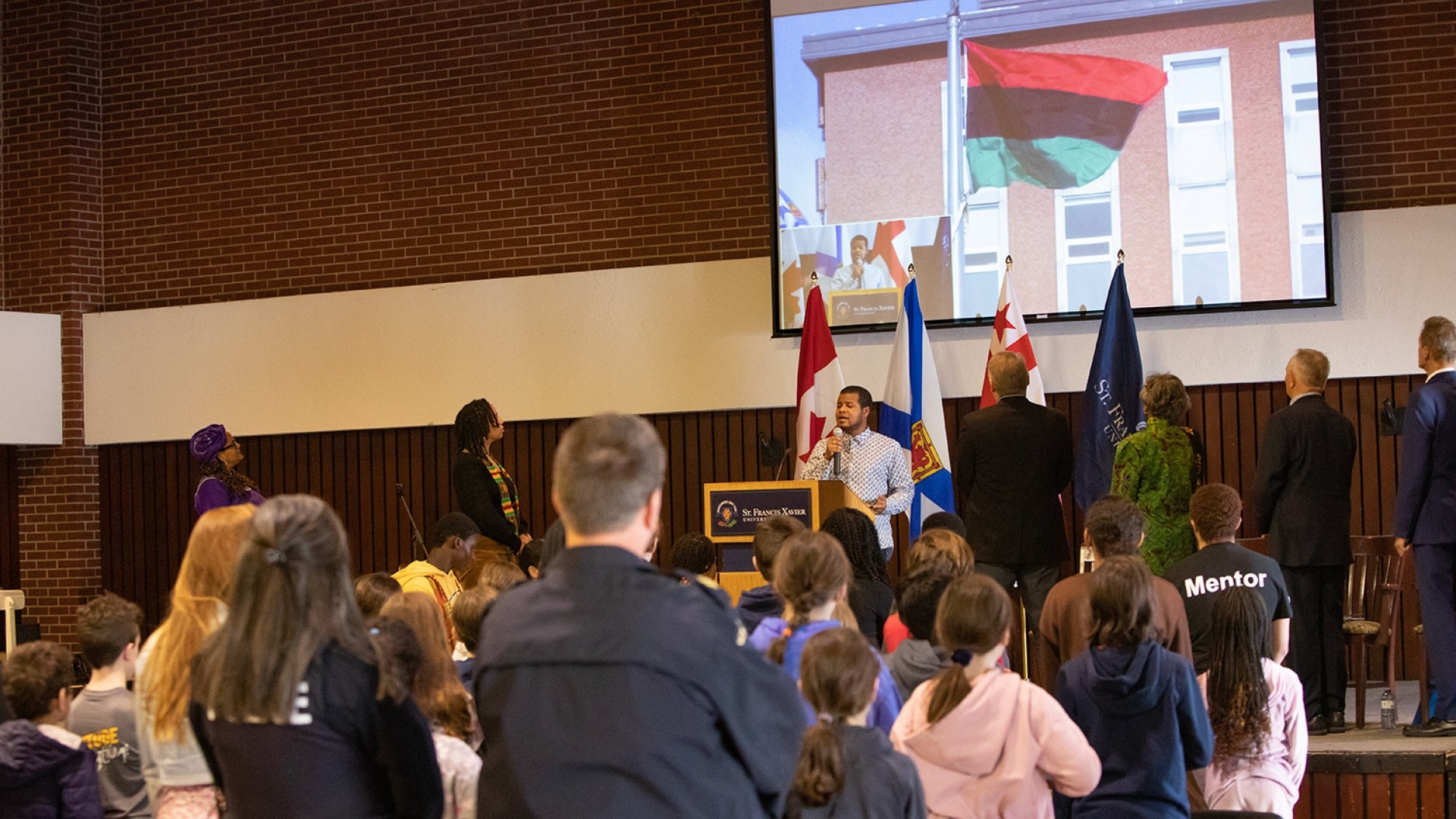 During the ceremony, StFX student Leah Pink, Dean of Science Dr. Joe Apaloo and StFX faculty Dr. Jonathan Hood raised the Pan-African Flag.
