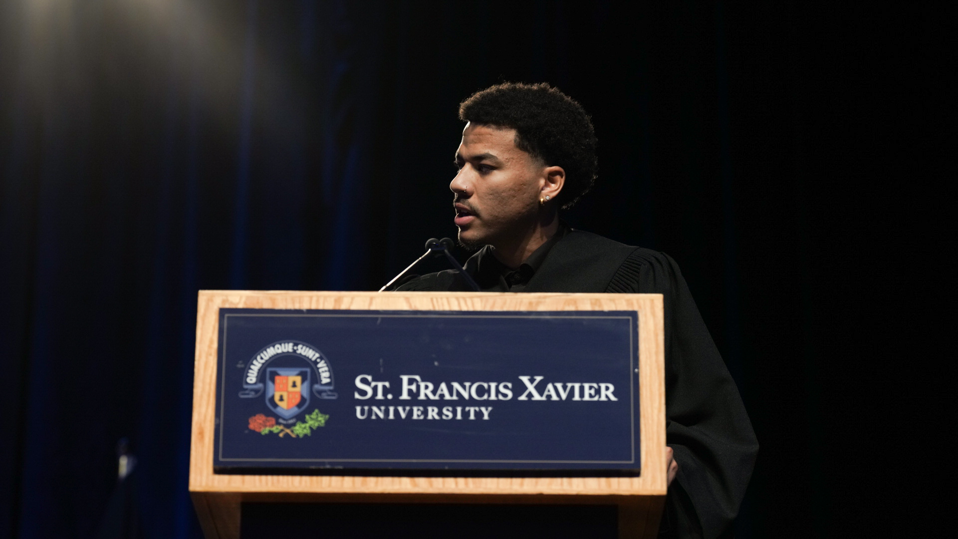 Dr. Hakin’s address was followed by remarks from Brett Baxter, Co-President of the StFX Senior Class. He talked about the special memories and friendships formed during one’s time at StFX. A New Brunswicker, he said he met “some of the kindest people in the world” in Antigonish and that he and his peers “will call this place our second home for life.”
