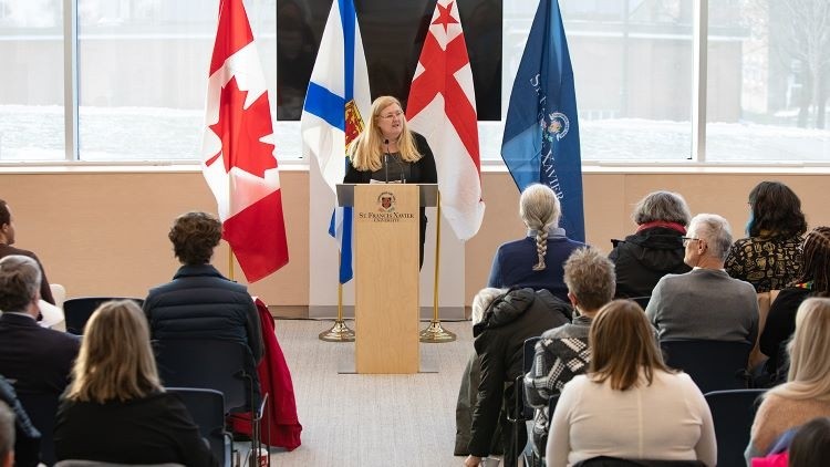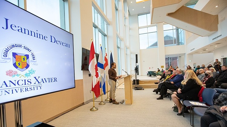 The life and legacy of a remarkable Xaverian was celebrated Jan. 25, 2023 as members of the StFX community gathered to pay tribute to the late Jeannine Deveau and the contributions she has made to StFX—impacting countless lives—during a ceremony held in the Joyce Family Atrium of Mulroney Hall.